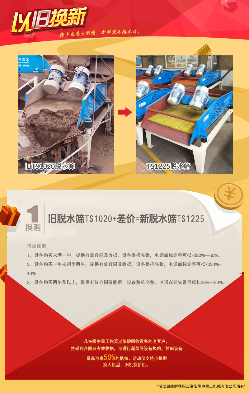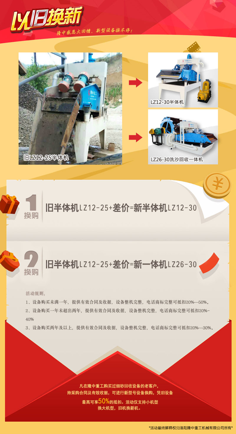 在本次的活動(dòng)期間,所有之前在洗砂機廠(chǎng)家洛陽(yáng)隆中重工購買(mǎi)過(guò)細砂回收機、洗砂機等設備的老客戶(hù),只需憑購機合同原件(或復印件)及有效收據,便可參加該活動(dòng)!憑舊設備較高可享50%的抵扣,所換的老設備沒(méi)有使用年限的限制,均可參與,可隨意選擇更換洗砂機廠(chǎng)家隆中重工所生產(chǎn)的洗沙回收一體機、洗砂機、脫水篩等設備!具體的更換更則見(jiàn)下文!